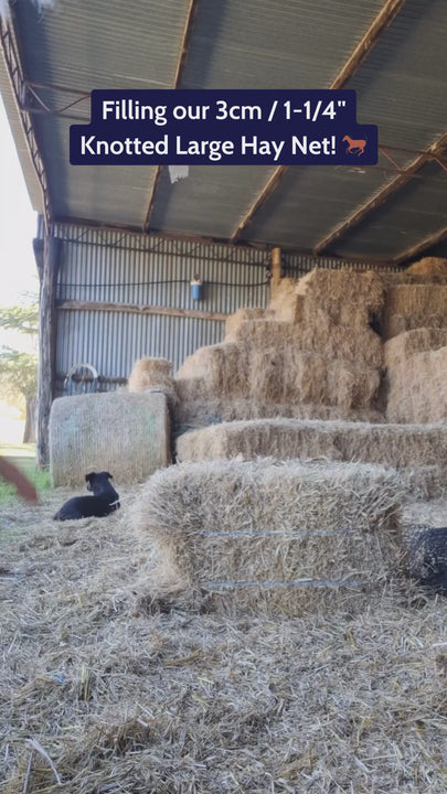 These wonderful nets reduce feed time by allowing you to put larger quantities of hay out at a time. The Large GutzBusta® Slow Feed Hay Nets will take an entire small square bale of hay. Their wide mouth makes them super easy to fill from the long side of the bale. It also makes them ideal for filling if you have no choice but to use and break up a round bale or large square export bale and want to feed out sections at a time.