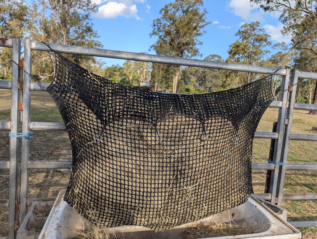 Although they are capable of holding a full small bale, due to our unique square shaped holes, it doesn’t matter if you have one biscuit of hay in this net, or half a small bale or have the hay net chock full, your animals will still be able to graze from the hay net, unlike diamond shaped holes that collapse down on each other as the hay net empties, leading to frustration for the horse when they get to the end.